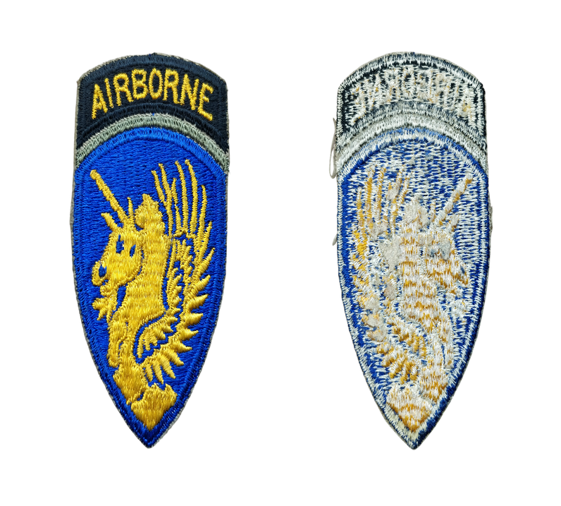 The insignia of the 13th Airborne Division is a shield shape with a golden unicorn on a blue background. Usually there is a black Airborne tab with yellow lettering above.
