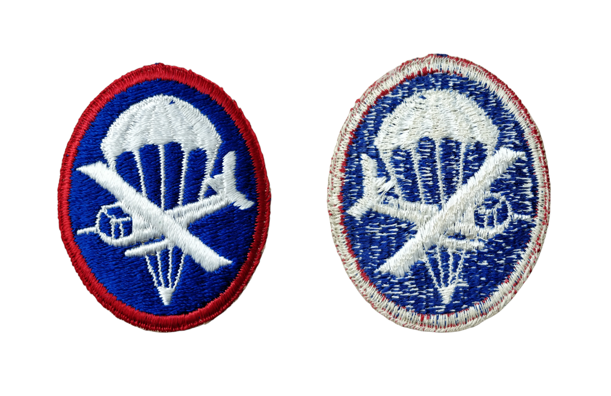 This insignia was worn from 1944 on and is the universal cap patch word by glider and airborne troops during World War Two. Patches for enlisted personnel were worn on the left side of the cap and officers wore the patch on the right side. In some cases Airborne troopers had sewn a silver Dollar under the patch to use as a slapper in bar fights or for good luck.