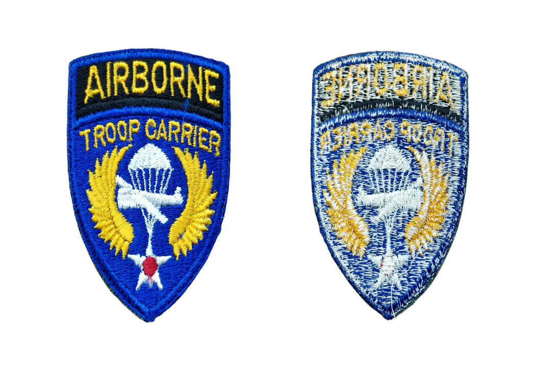 The insignia of the Airborne Troop Carrier is a shield shape with an airplane with a parachute and wings on a blue background. Usually there is a black Airborne tab with yellow lettering above.