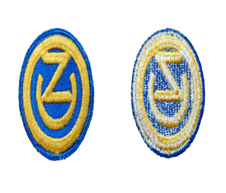 The insignia of the 102nd Infantry Division is a blue round shape with a yellow border. Inside is a yellow C and Z on top of each other.