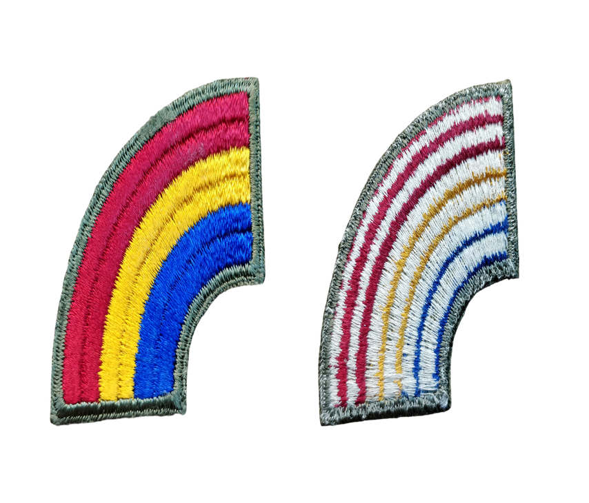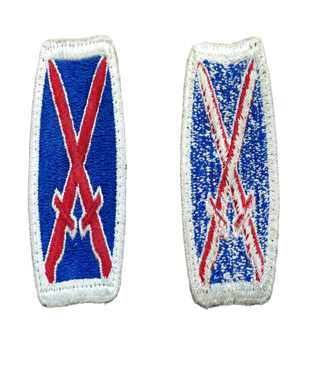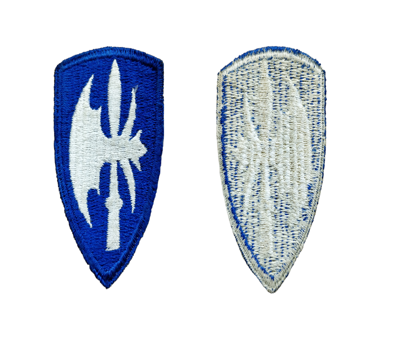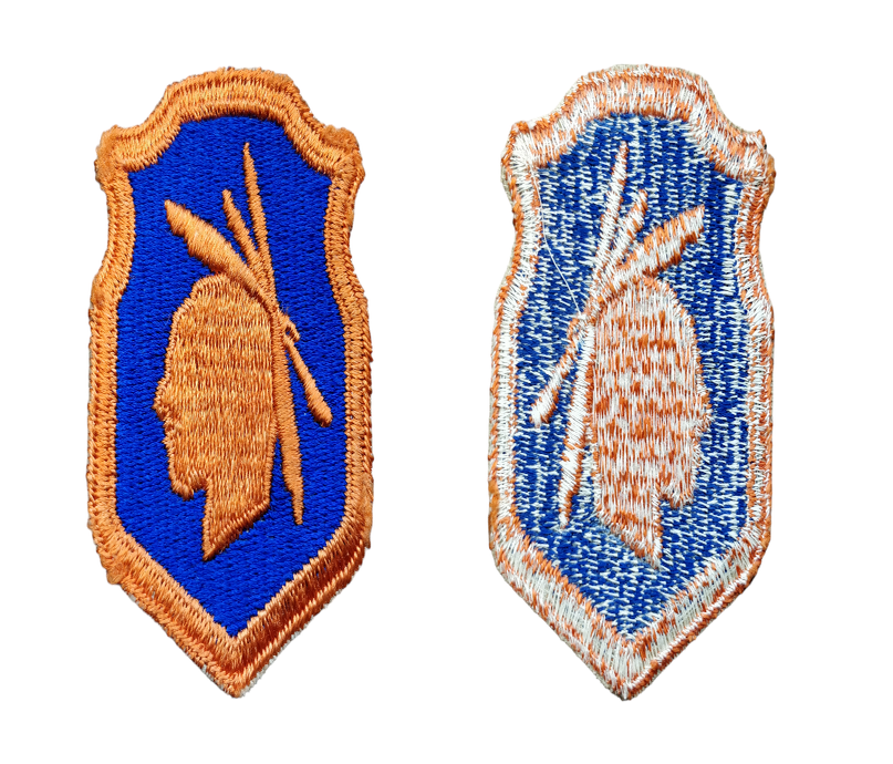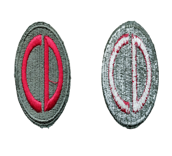The insignia of the 100th Infantry Division is a blue shield shape with a white and yellow '100' in the middle.
