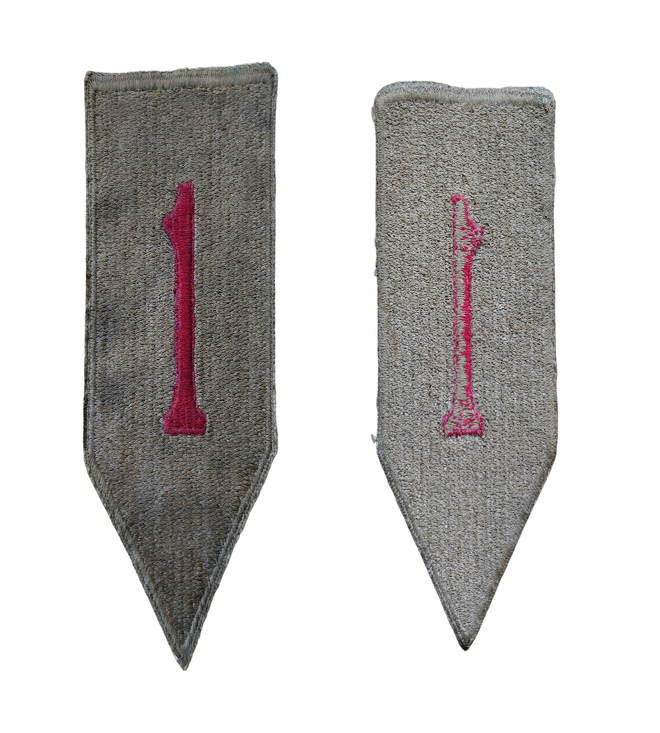 The insignia of the 1st Infantry Division is a green shield shape with a red one in the middle.