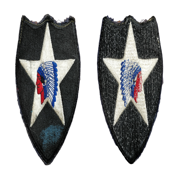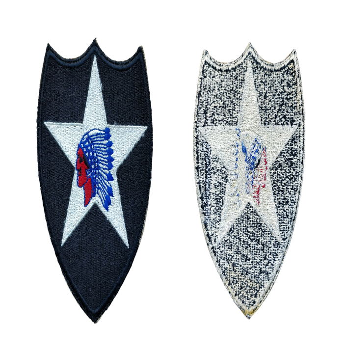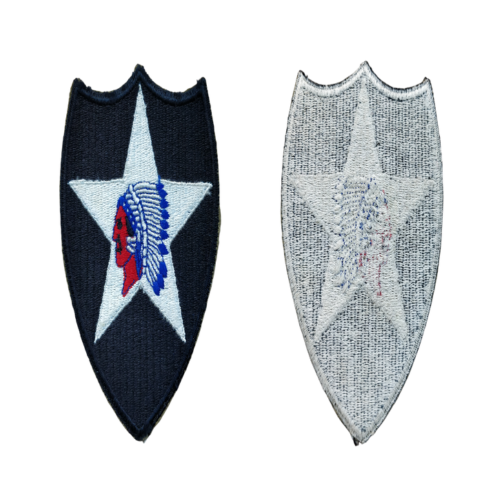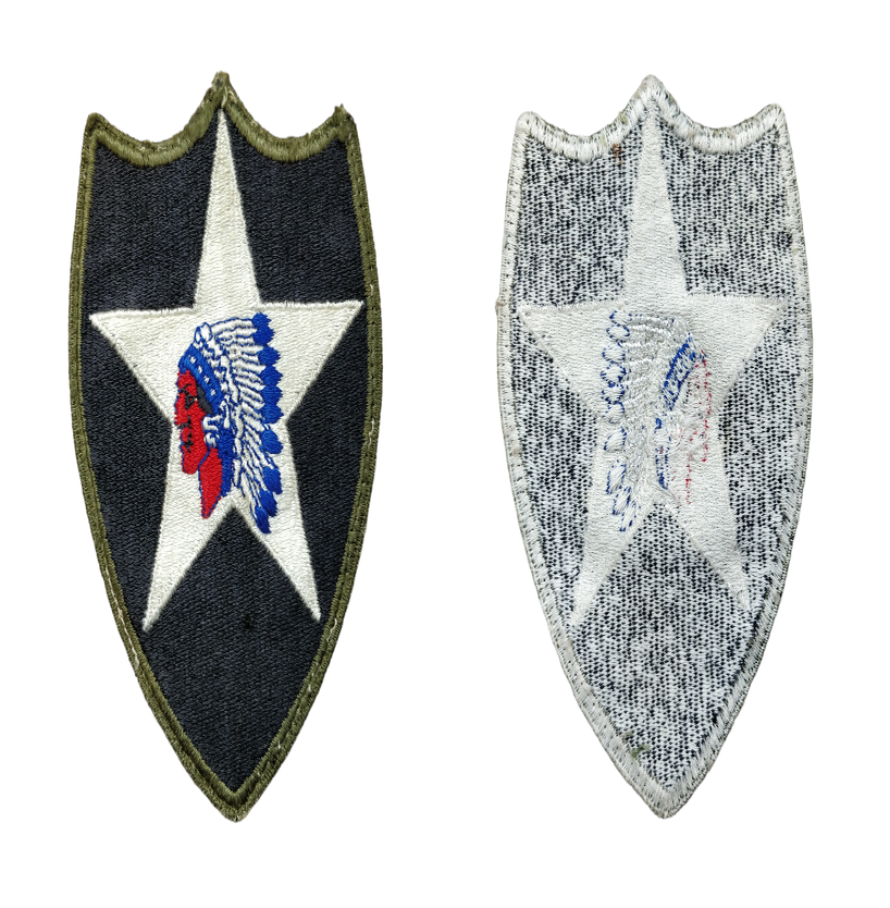 The insignia of the 2nd Infantry Division is a black shield shape with in the middle a white star. Inside of the white star is and Indians head.