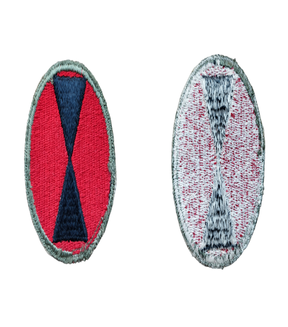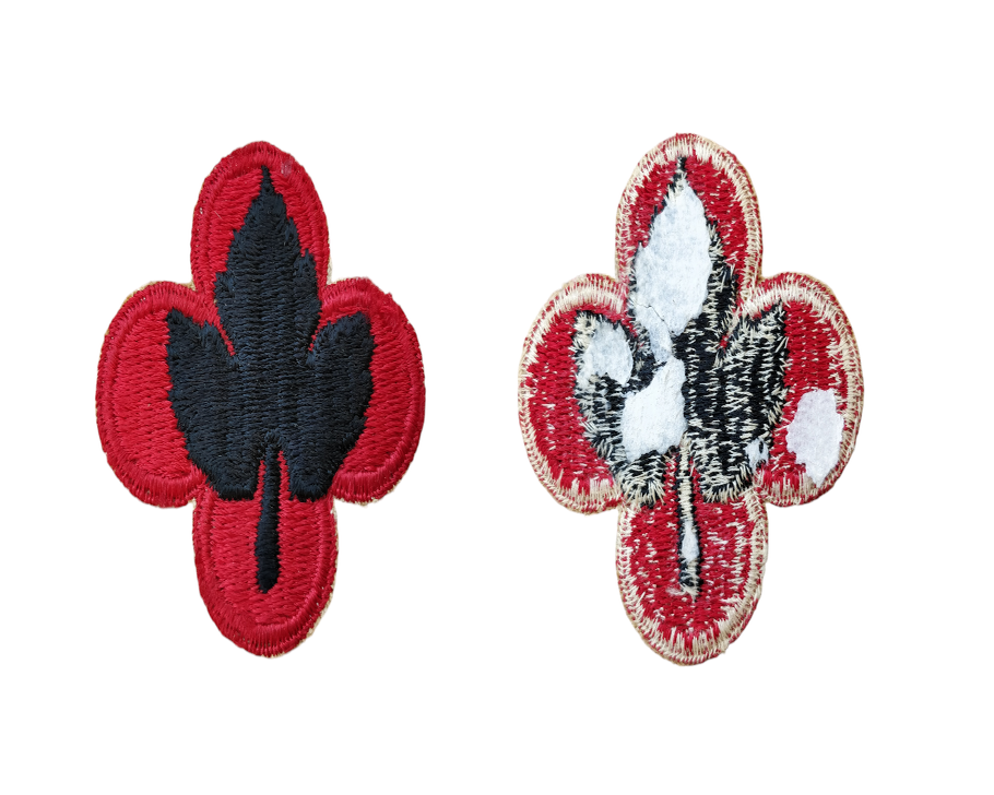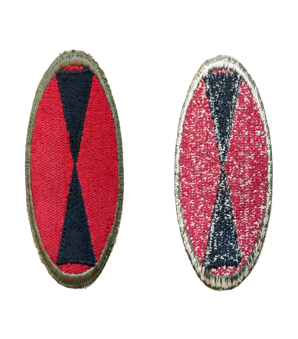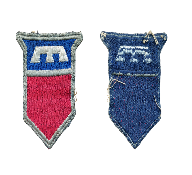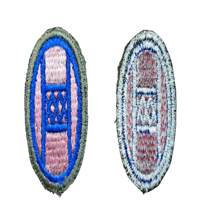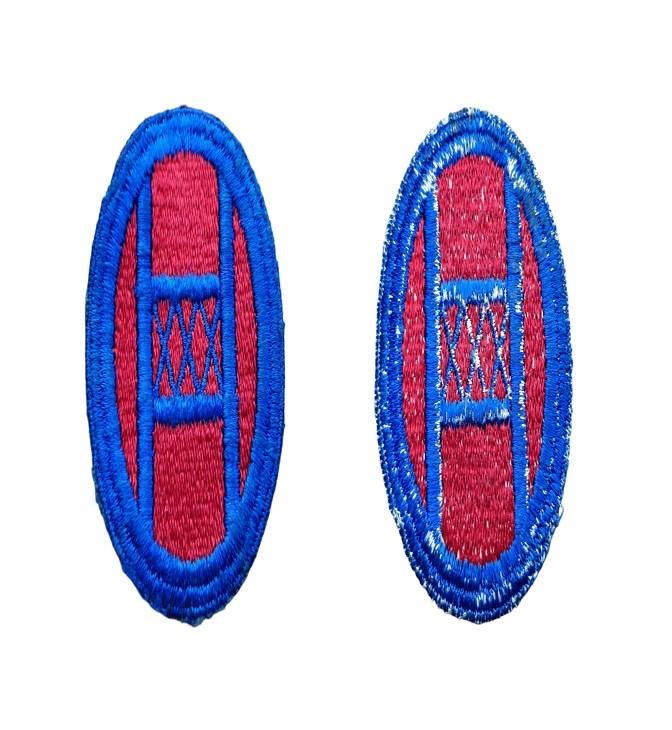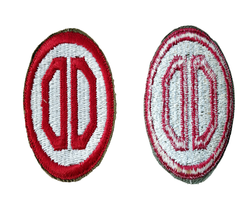 The insignia of the 30th Infantry Division is a red oval with a blue border and in the middle a blue 'H' with three X's.