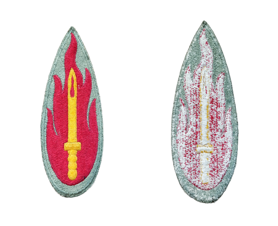 The insignia of the 25th Infantry Division is a red leaf shape with a yellow border and a yellow lightning bolt in the middle.