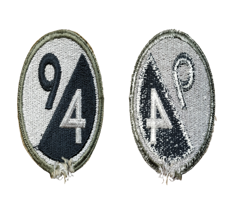 The insignia of the 94th Infantry Division is a round shape with a gray and black background. In the gray piece is a black 9 and in the black piece is a gray 4.