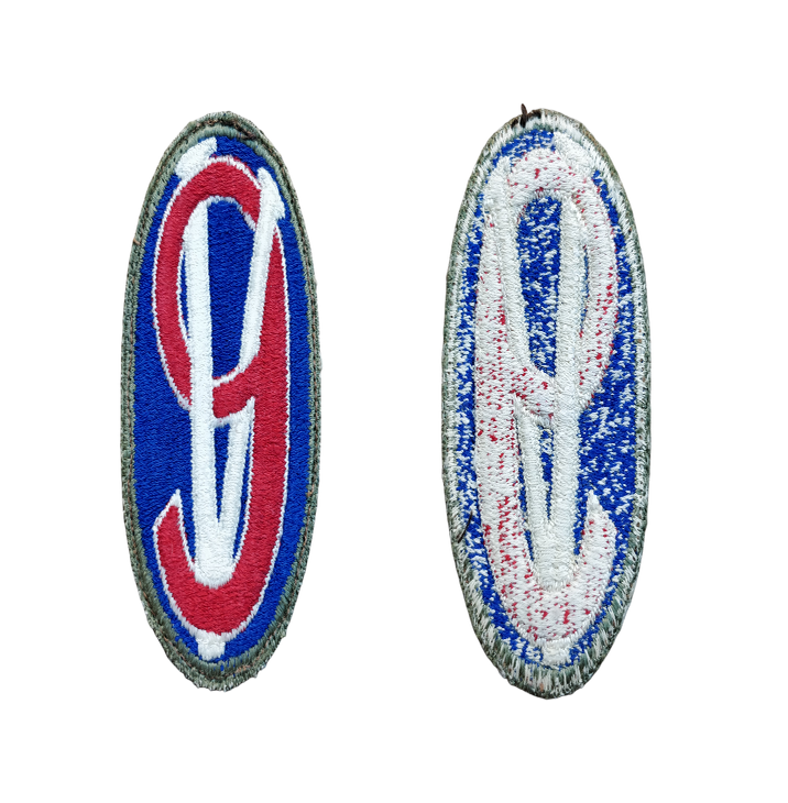 The insignia of the 95th Infantry Division is a blue oval shape with a red 9 and a white V (roman for 5) in the middle.