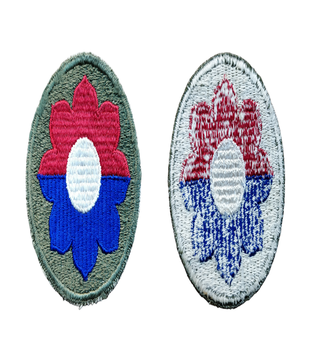 The insignia of the 9th Infantry Division is a green circle with in the middel a flow with red leaves at the top, blue leaves at the bottom and a white center.