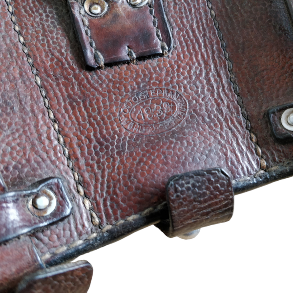 The pouch has signs of use, and there are some spots on the front, but the leather is still fairly supple. The pouch is black, as worn by the Wehrmacht. The pouch is nicely stamped 1939 and all partitions are removed. A nice addition to your Wehrmacht display!