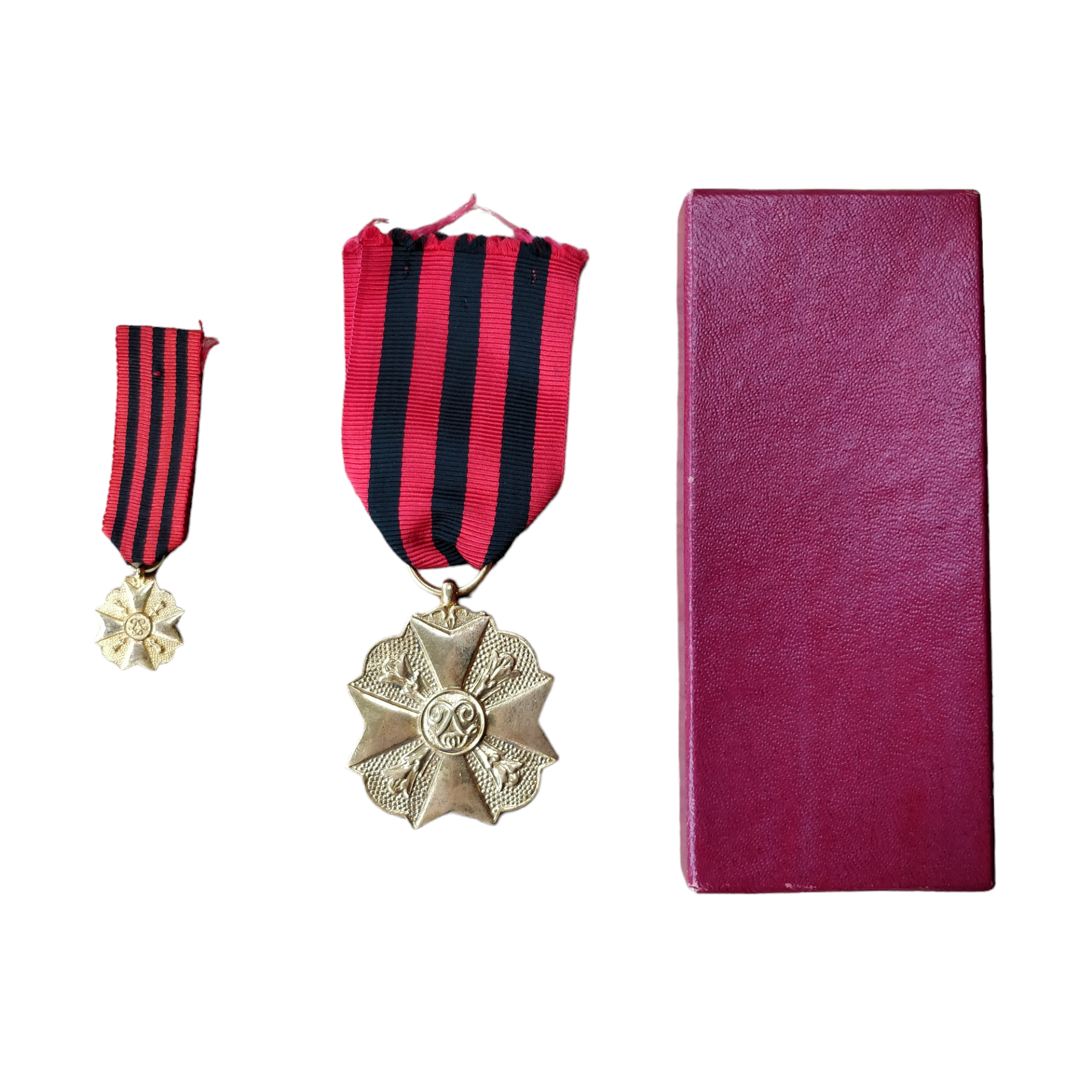 These medals were given to Belgian civilians who participated in war efforts. The ribbon which is red with three vertical black stripes stands for long and distinguished service in the administration.