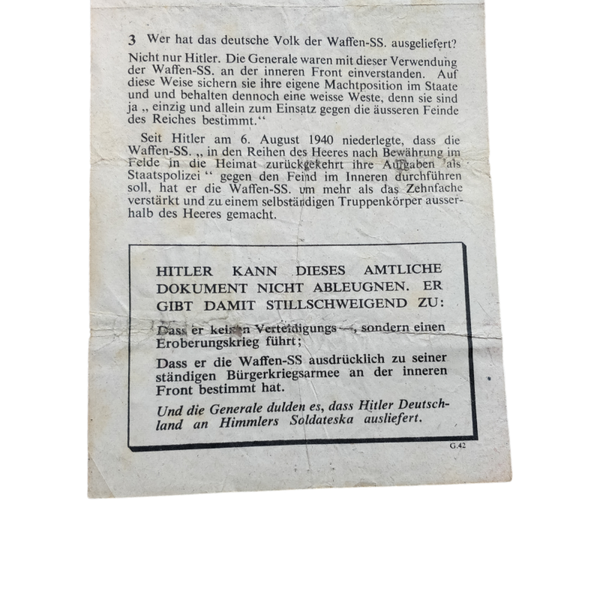Het pamflet heeft wat gebruikssporen maar is nog goed leesbaar. Deze stukken werden afgeworpen en verspreid onder de bevolking. Een interessant stuk voor je collectie!