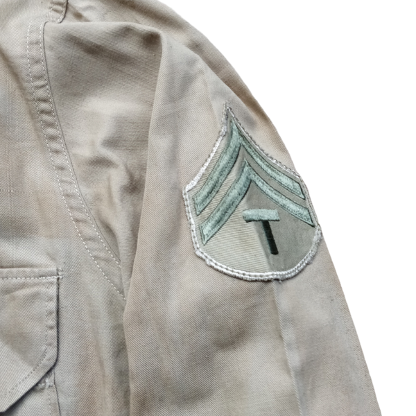 De blouse heeft zijn gebruikssporen, zoals te zien zijn er vlekken aanwezig. In de kraag staat nog een Laundry code. De rangen op de mouwen staan voor een Technician 5th Grade.
