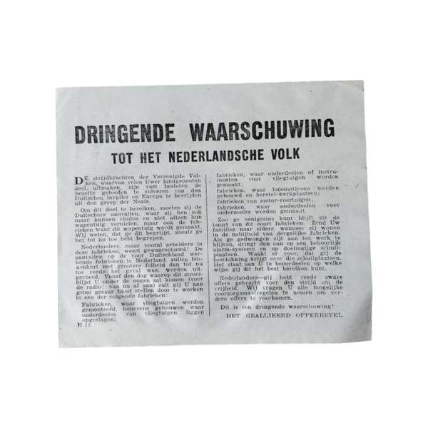 Het pamflet heeft wat gebruikssporen maar is nog goed leesbaar. Deze stukken werden afgeworpen en verspreid onder de bevolking. Een interessant stuk voor je collectie!