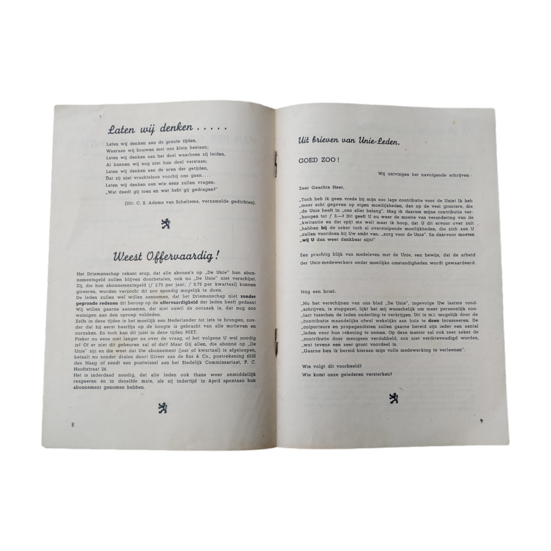 The brochure has signs of use. An interesting piece for the Dutch collector! This brochure was published by the Dutch Union, a counterpart of the NSB.