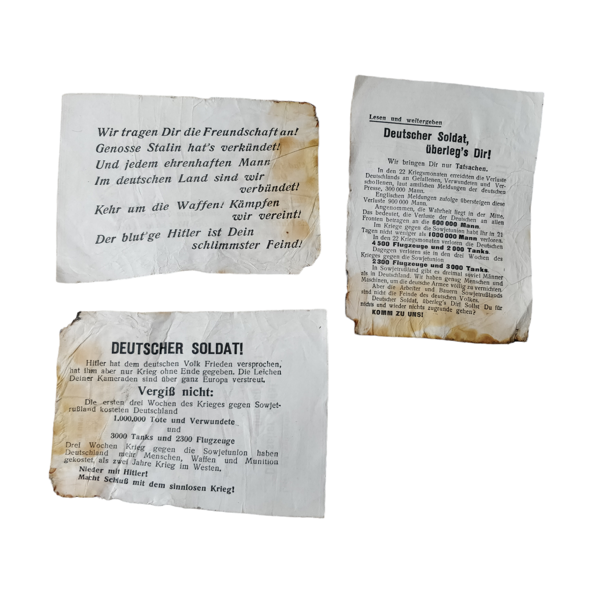 Het pamfletten hebben wat gebruikssporen maar zijn nog goed leesbaar. Deze stukken werden afgeworpen en verspreid onder de bevolking. Een interessante set voor je collectie!