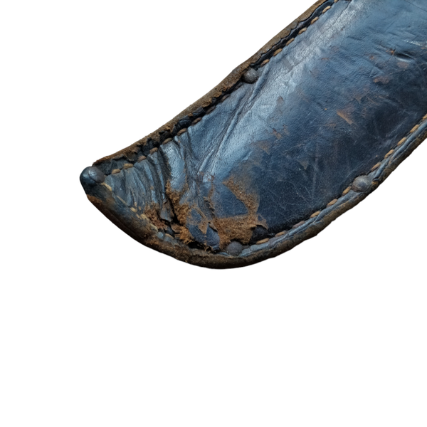 The knife has its traces of use. The knife was sharpened at some point and the leather sheath has some damage/a tear at the bottom. Overall it is a nice piece for the collector! These combat knives were mainly issued to American soldiers who were part of the US Navy.