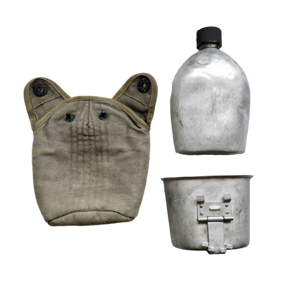 Dit type veldfleshoes werd in eerste instantie gemaakt voor de cavelerie maar werd daarna geliefd onder parachutisten bij de US Airborne, de verstevigde hoezen werden in combinatie met de lichtgewicht aluminium flessen gebruikt bij onder andere D-Day en Market Garden. De hoes,canteen en cup zijn allen 1942 gedateerd. Een mooi item om je mannequin/uitrustingsset compleet te maken!