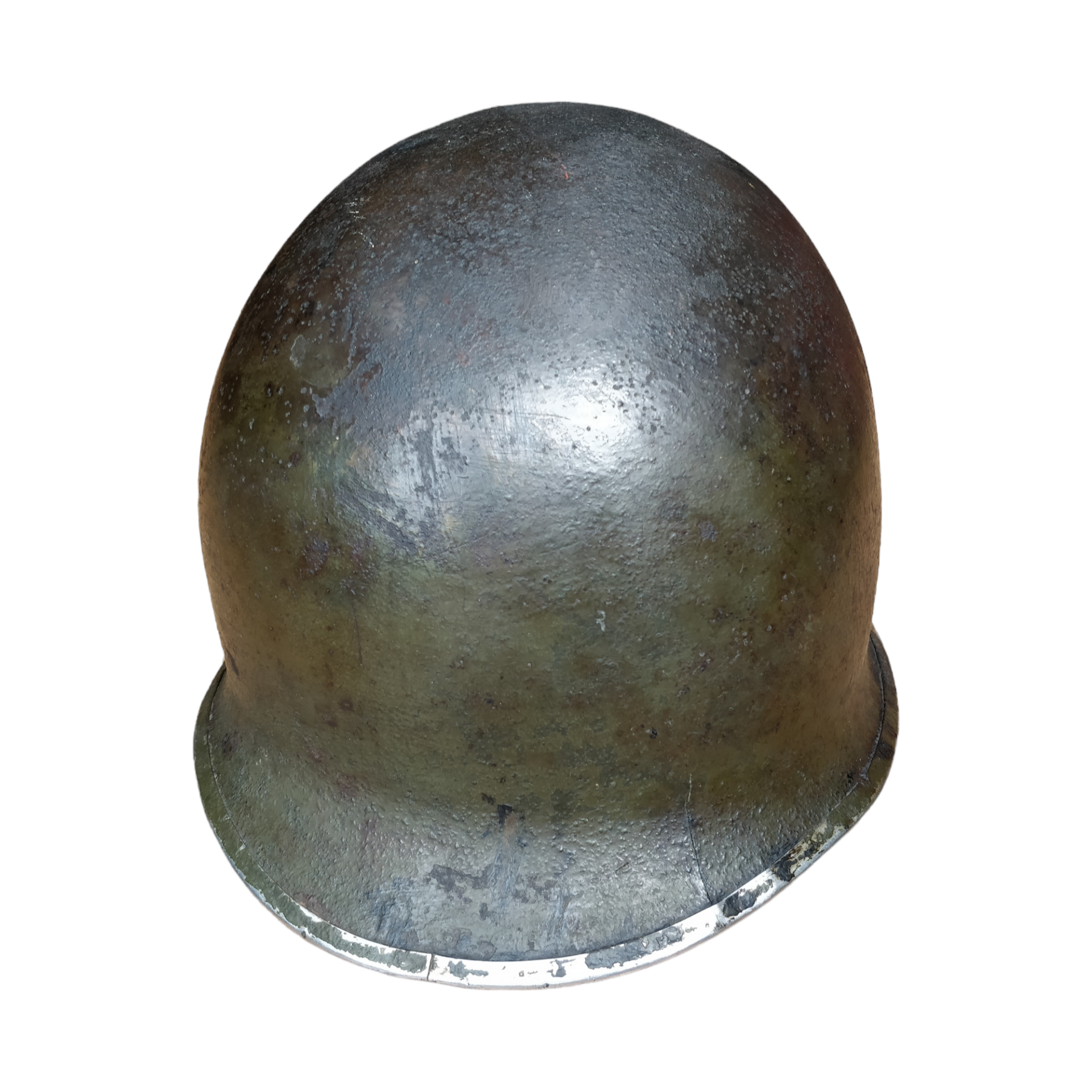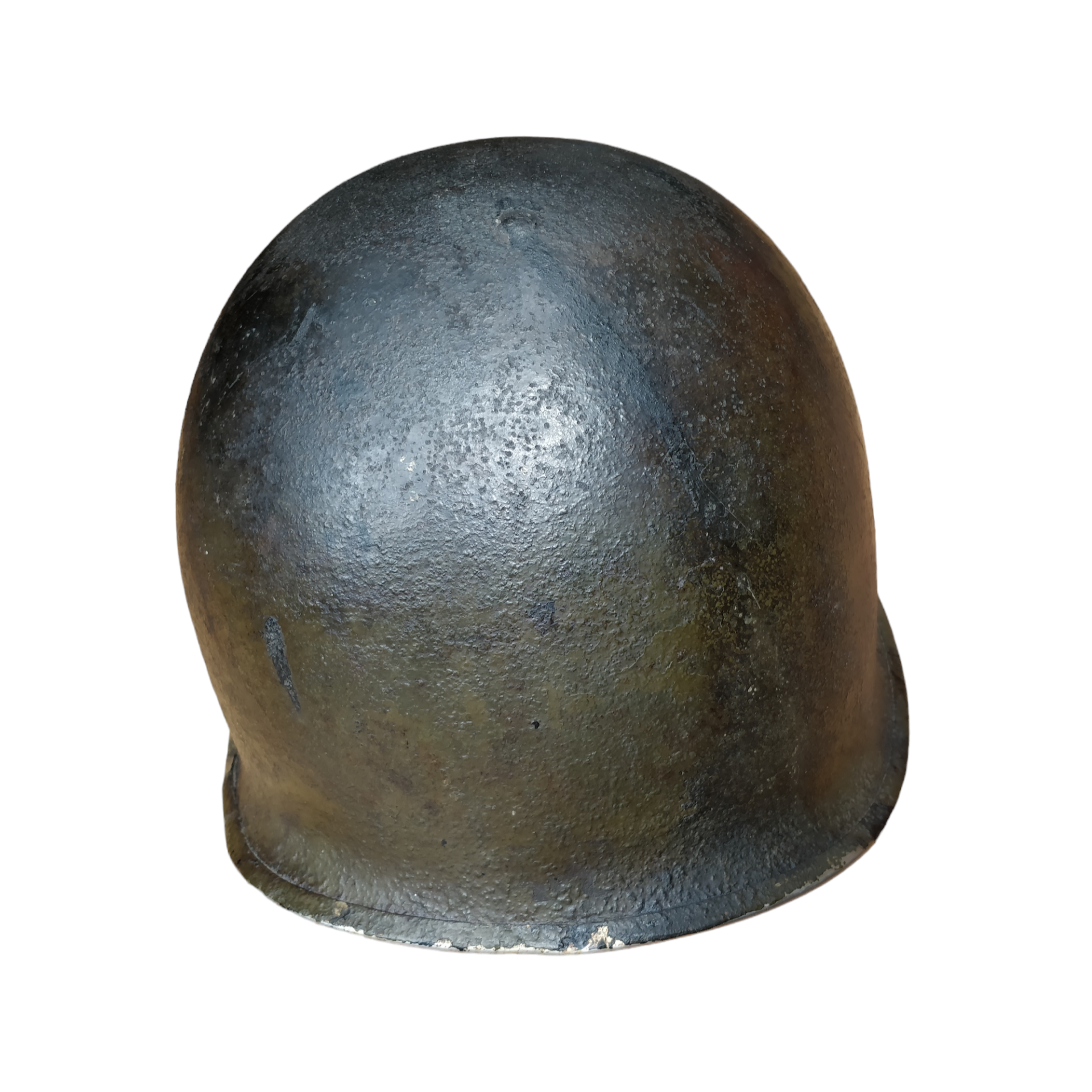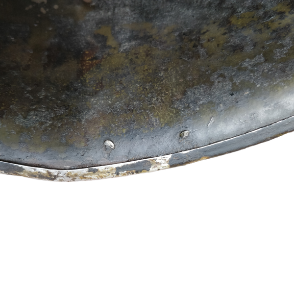 De Helm is nog in redelijke nette staat, helaas zijn de fixed bale haken afgebroken/verwijderd. De helm lijkt gebruikt te zijn geweest om te koken of iets dergelijks gezien er wat zwarte restanten aan debinnenzijde zitten. Aan de zijkant van de helm staan de initialen E C ingekrast. Ook is de heatstamp nog goed te lezen, 76E, wat duid op een productie tussen midden en eind 1941! Een mooie vroege helm voor de militaria verzamelaar!