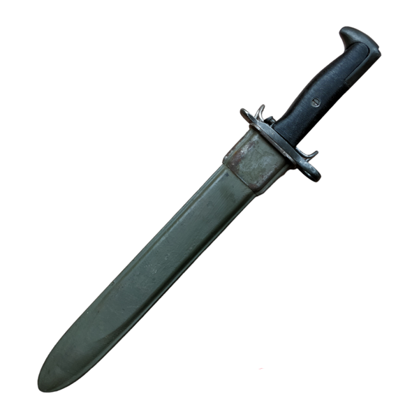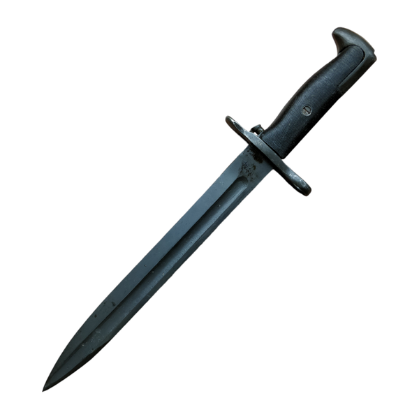 De bajonet is nog in zeer nette staat. De schede is overgeschilderd. Deze bajonetten werden door Amerikaanse soldaten gedragen tijdens de Tweede Wereldoorlog. Dit exemplaar is netjes gedateerd en betreft een ingekort model. Een mooi stuk voor de US verzamelaar!