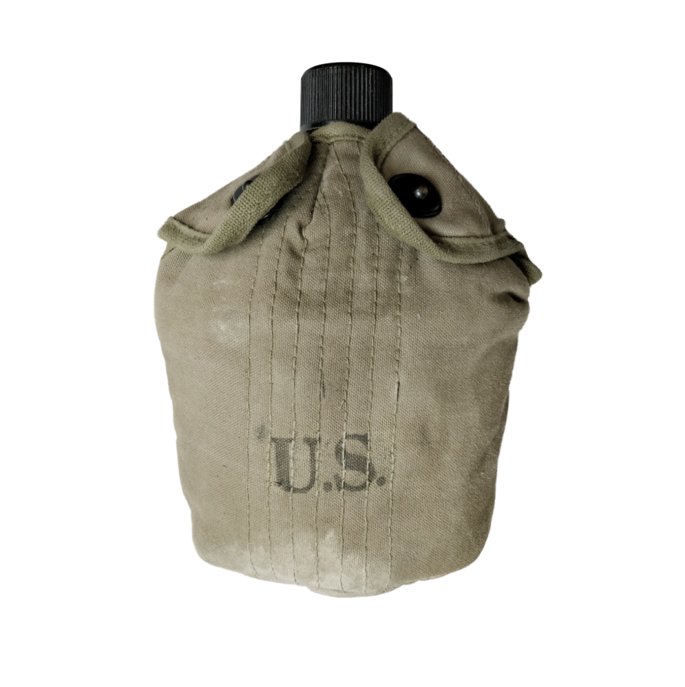Dit type veldfleshoes werd in eerste instantie gemaakt voor de cavelerie maar werd daarna geliefd onder parachutisten bij de US Airborne, de verstevigde hoezen werden in combinatie met de lichtgewicht aluminium flessen gebruikt bij onder andere D-Day en Market Garden. De canteen en cover zijn beiden 1943 gedateerd, de caup is 1941 gedateerd. Een mooi item om je mannequin/uitrustingsset compleet te maken!