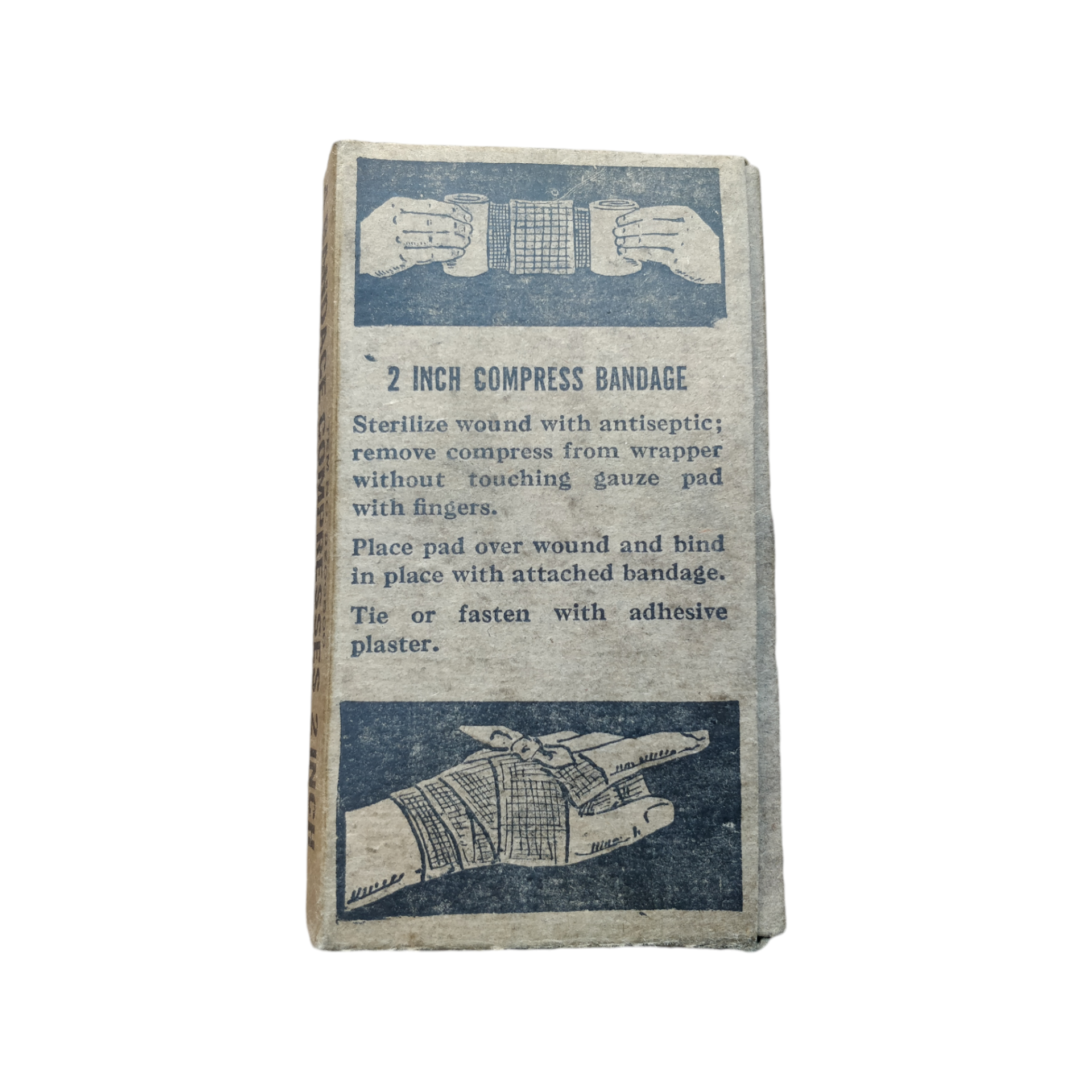 Het doosje is nog in redelijk nette staat maar heeft wat gebruikssporen. Dit soort compressen zaten bij de uitrusting van de Amerikaanse Medic. Een interessant stuk voor je US collectie!