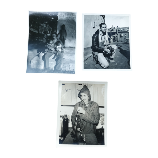 De fotos zijn nog in nette staat. De grootste foto is wat groter dan A4. De kleinere foto's zijn zo ongeveer tussen A6 en ansichtkaart formaat. De set bestaat uit 10 foto's van dezelfde persoon die in de pacific vocht en op Okinawa heeft gezeten. Op de fotos zijn interessante details te zien zoals de camouflage kleding van het kind, camera en holster op een ship en het schoonmaken van de thompson. Een interessante set voor de verzamelaar!