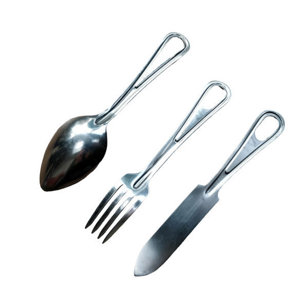 De set heeft wat gebruikssporen. De set bestaat uit Mes, Vork en lepel. Een leuke toevoeging aan je collectie persoonlijke items!