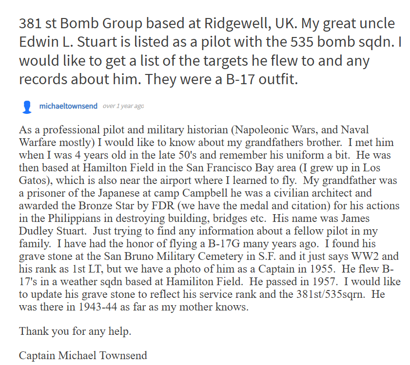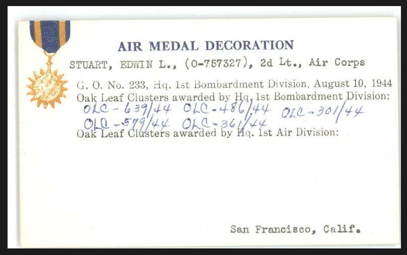 De map met documenten heeft lichte gebruikssporen maar is over het algemeen nog in nette staat. Het betreft hier een personnel file van Piloot Stuart die vloog in een B-17 bommenwerper. In zijn personnel file zijn onder andere foto's, opleidingsdocumenten, promoties, flight crews en een uitrrustings uitreikingsdocument te vinden. Stuart was onderdeel van de 8th Air Force en vloog missies over Europa. Er is al enige informatie achterhaald via internet waaronder informatie over missies en de uitreiking van de Air Medal met Oak leafs. Een zeer interessante set voor verder onderzoek!