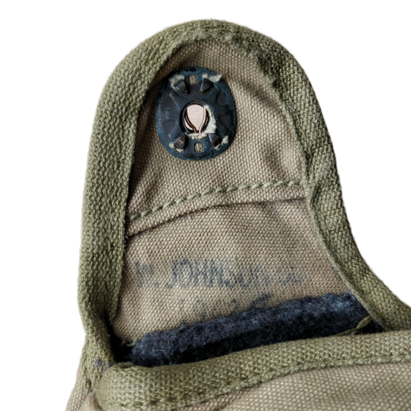 This type of canteen cover was initially made for the cavery but subsequently became popular among paratroopers in the US Airborne, the reinforced covers were used in combination with the lightweight aluminum bottles during D-Day and Market Garden, among others. The cover and canteen are both dated 1942, the cup is unmarked. A nice item to complete your mannequin/equipment set!