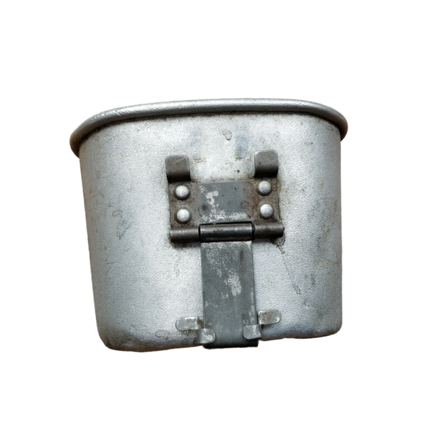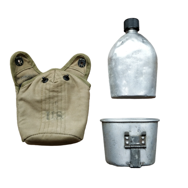 Dit type veldfleshoes werd in eerste instantie gemaakt voor de cavelerie maar werd daarna geliefd onder parachutisten bij de US Airborne, de verstevigde hoezen werden in combinatie met de lichtgewicht aluminium flessen gebruikt bij onder andere D-Day en Market Garden. De hoes en canteen zijn beiden 1942 gedateerd, de cup is ongedateerd. Een mooi item om je mannequin/uitrustingsset compleet te maken!