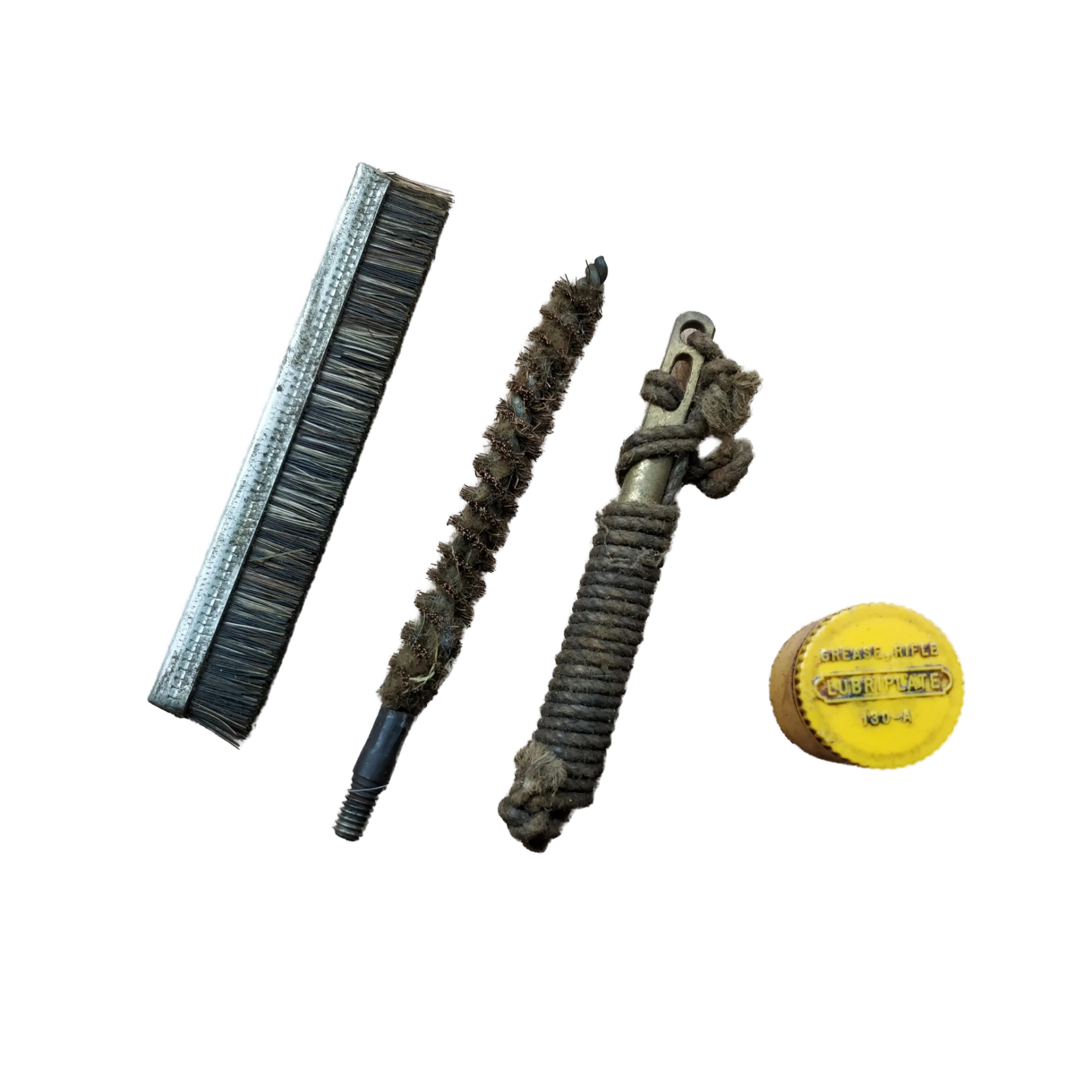 De set is in goede staat en bestaat uit een borsteltje, staafje met touw en potje rifle grease. Een leuke set voor display!