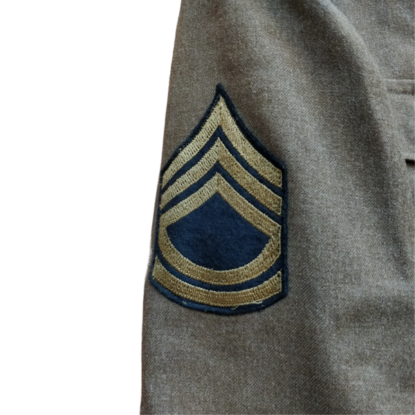 Het jasje is nog in nette conditie. Op de jas zitten Technical Sergeant Rank stripes, 2 Overseas bars, een meritorious patch, Pacific forces patch en military police collar discs. Het label 1944 is nog goed leesbaar. Een mooie toevoeging aan je collectie Amerikaanse items!