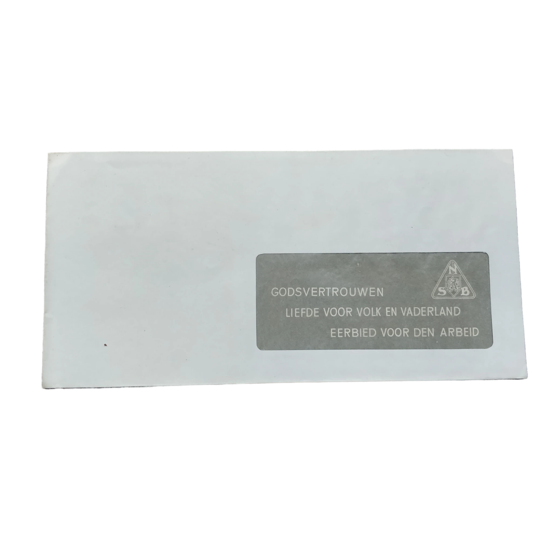 The envelope is still in good condition. There are some light signs of wear and the back is stuck shut due to the age of the glue. These envelopes were used by the NSB (National Socialist Movement). An interesting piece for your Dutch collaboration collection!