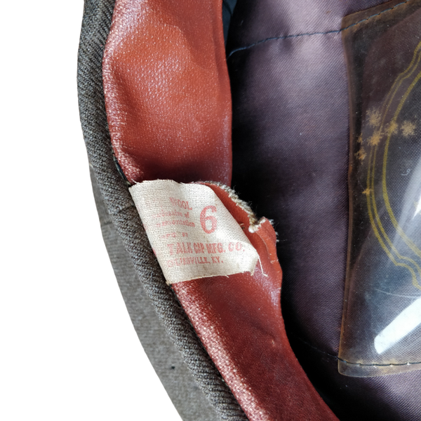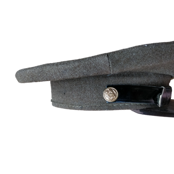 The visor cap is in used condition. The emblem on the front is still neat. This is a visor cap for enlisted men. The cap has some signs of wear and moth spots.
