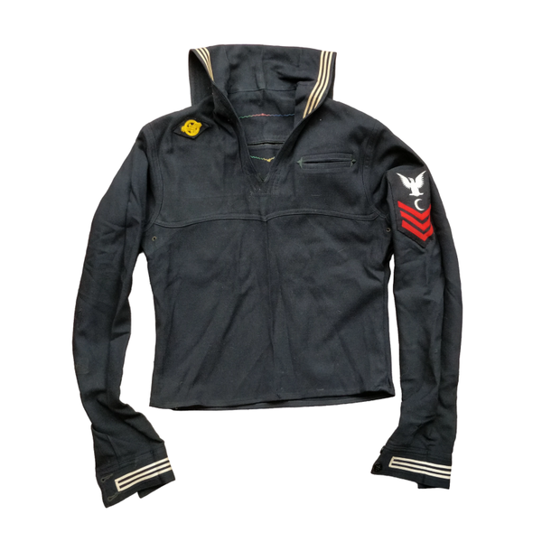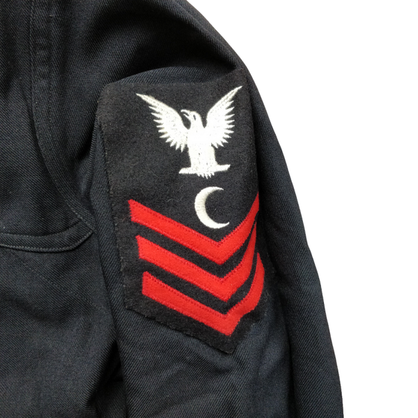The jacket is still in good condition. The ruptured duck is slightly loose. The rank stands for a Cook, Petty Officer 1st Class. A nice addition to your US Navy collection!