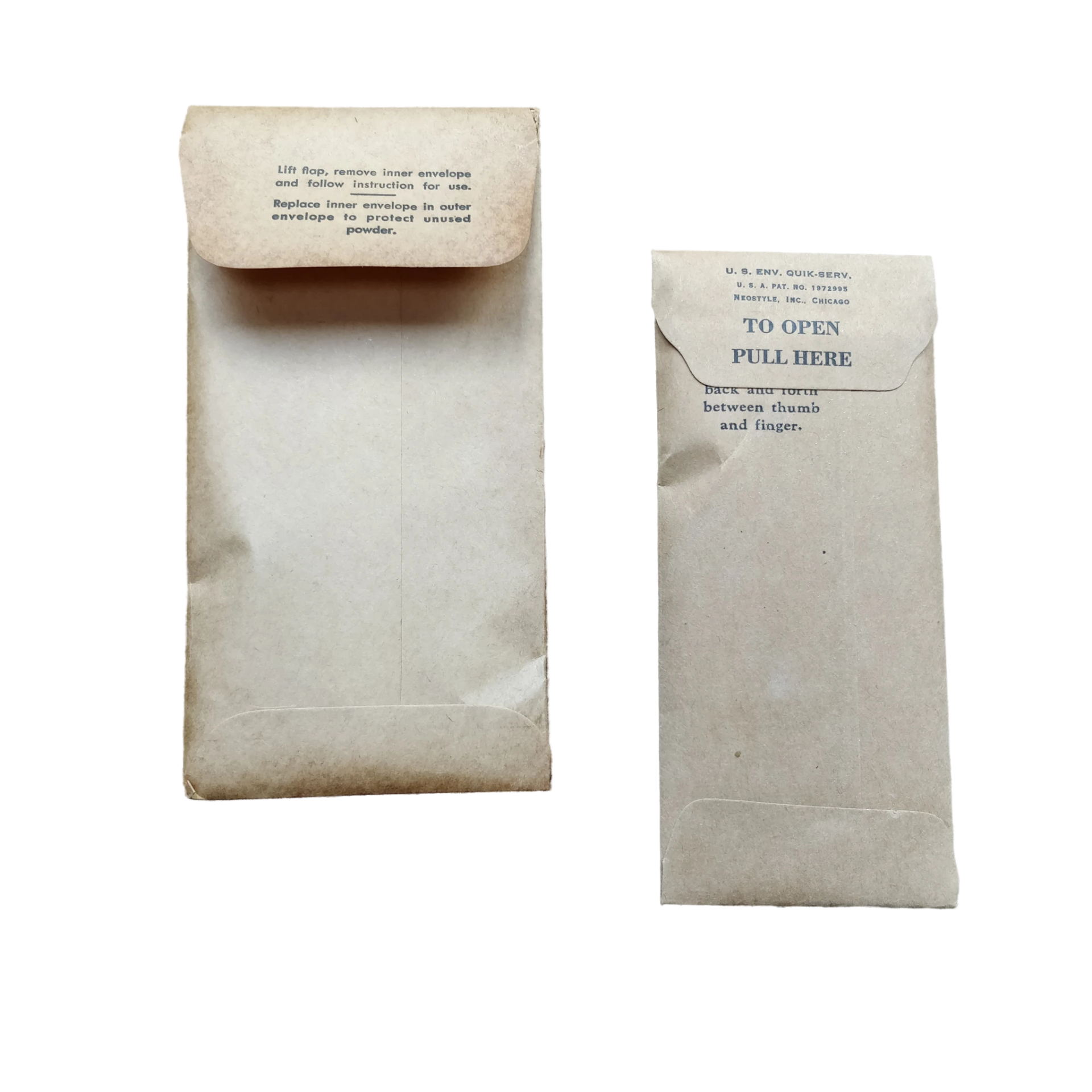 This set consists of two packages: a sachet containing powder and an outer package. The outer package shows some signs of wear. The sachet is still full and sealed! This version is much less common than the tins. A nice addition to any American soldier's personal belongings!