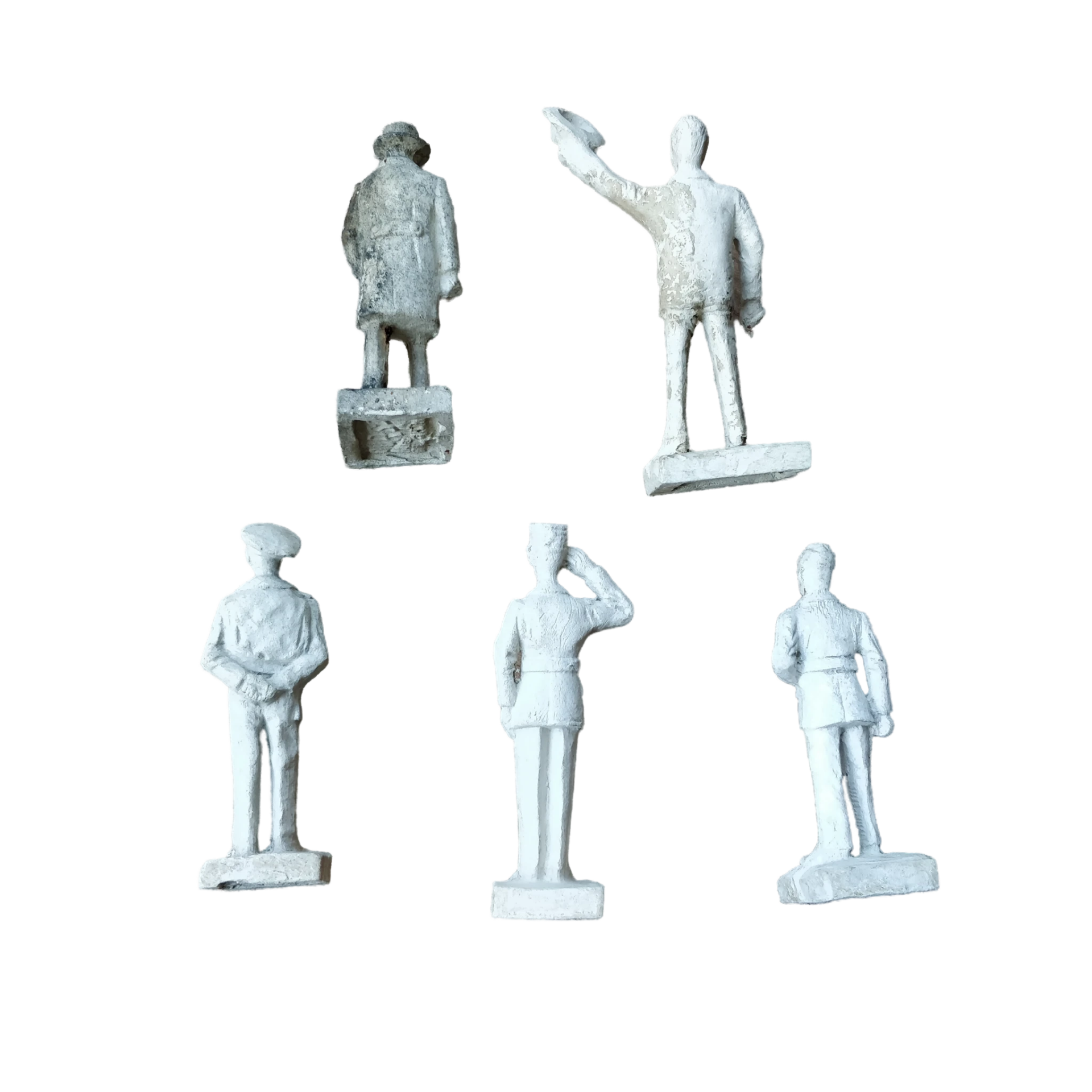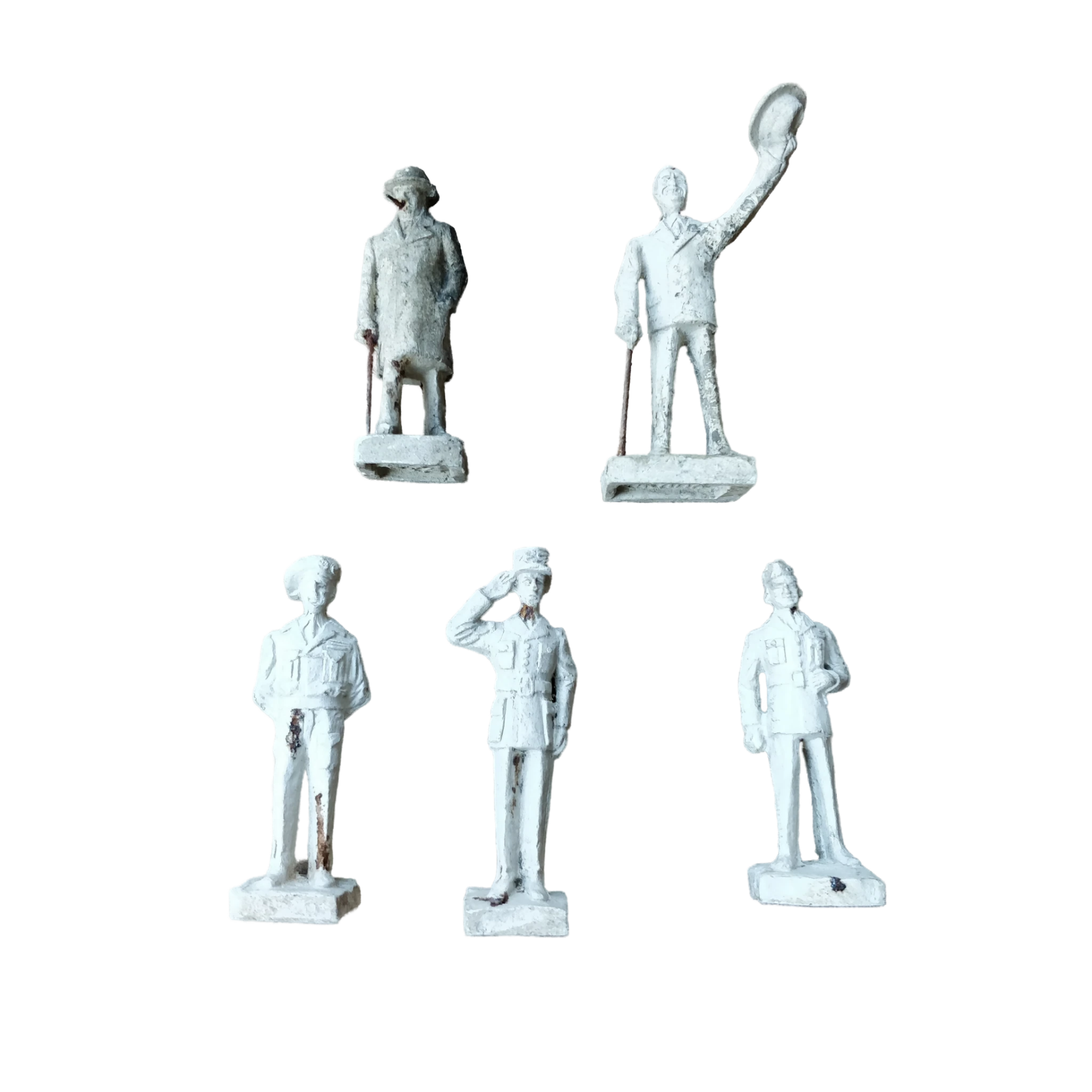 Het poppetjes zijn nog in redelijk nette staat en zijn gemaakt van klei. Deze poppetjes werden door de Belgische fabrikant DURSO uit Luik/Liége gemaakt rond de bevrijding van Belgie ter ere van de hoofdpersonen die hierbij hadden geholpen. Een interessante set voor je verzameling!