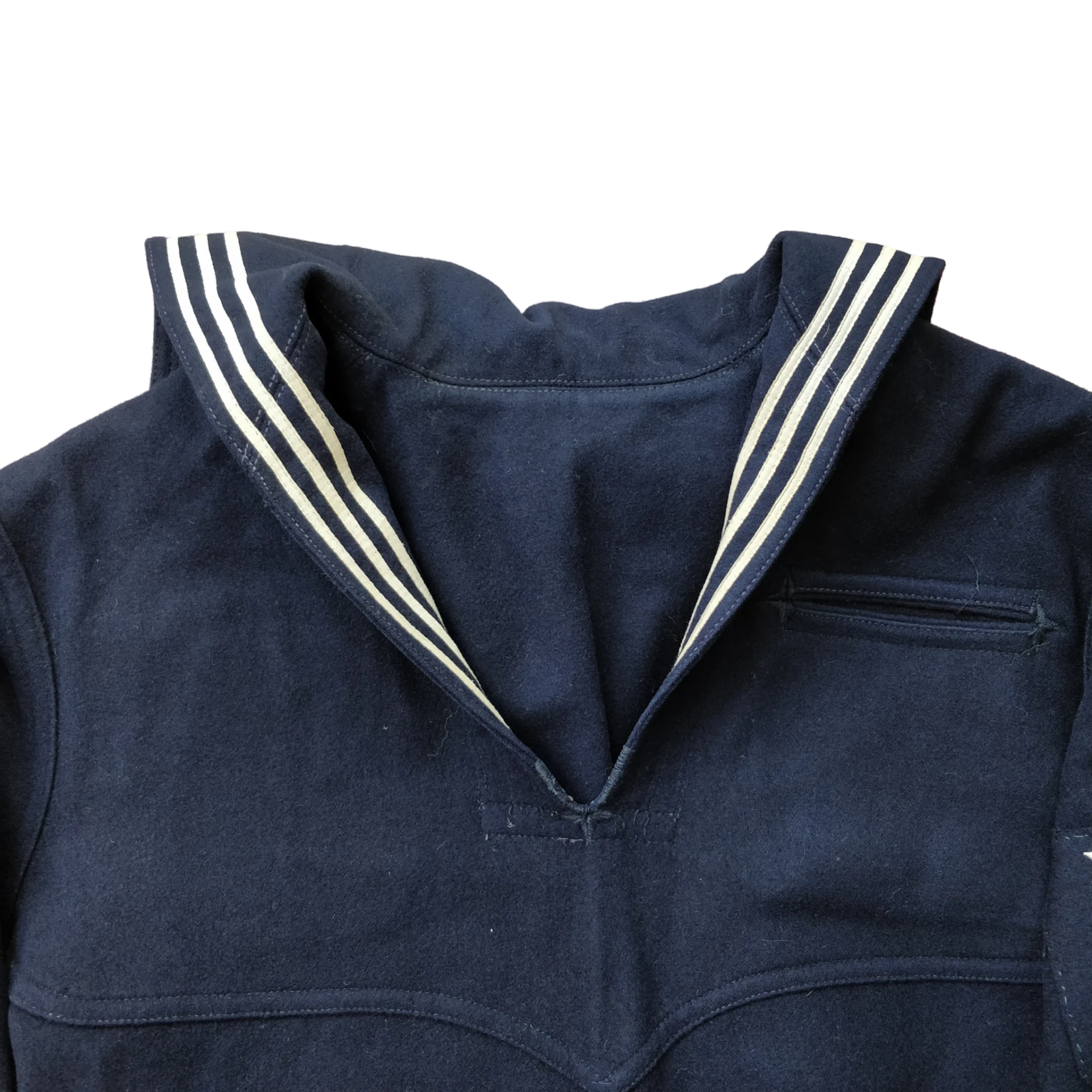 The jacket is still in good condition. There is still a label showing the maker and the jacket is even registered in name! A nice addition to your American Navy collection! On the sleeve are Blacksmith and CB (Seabees) insignia.