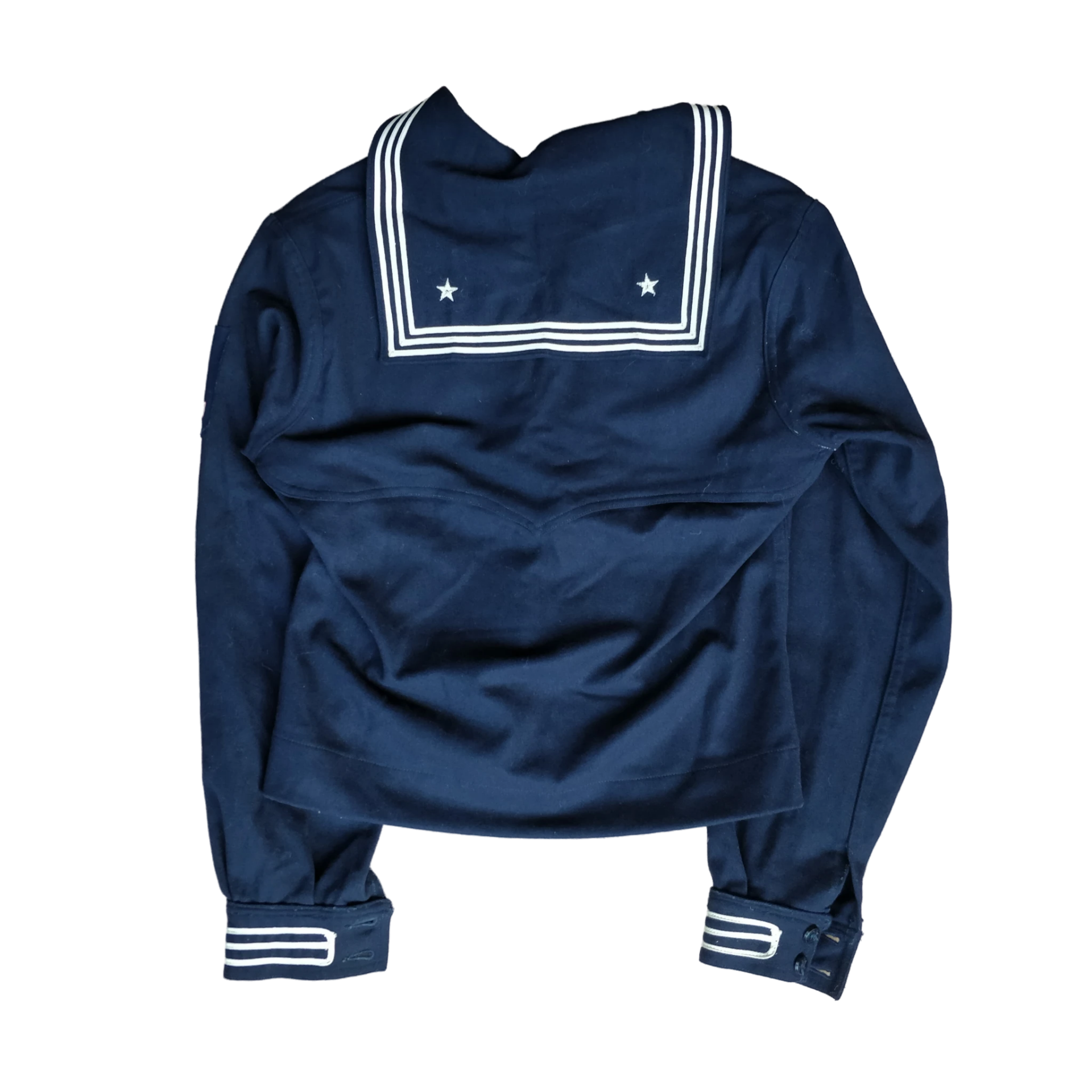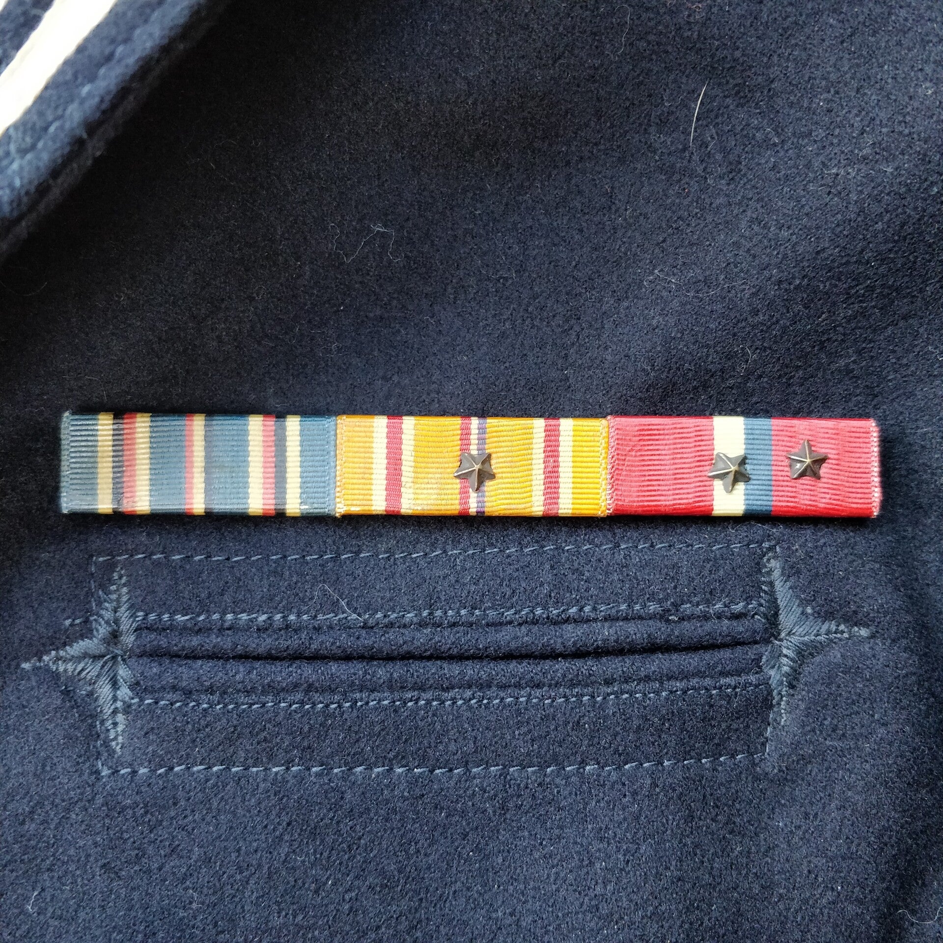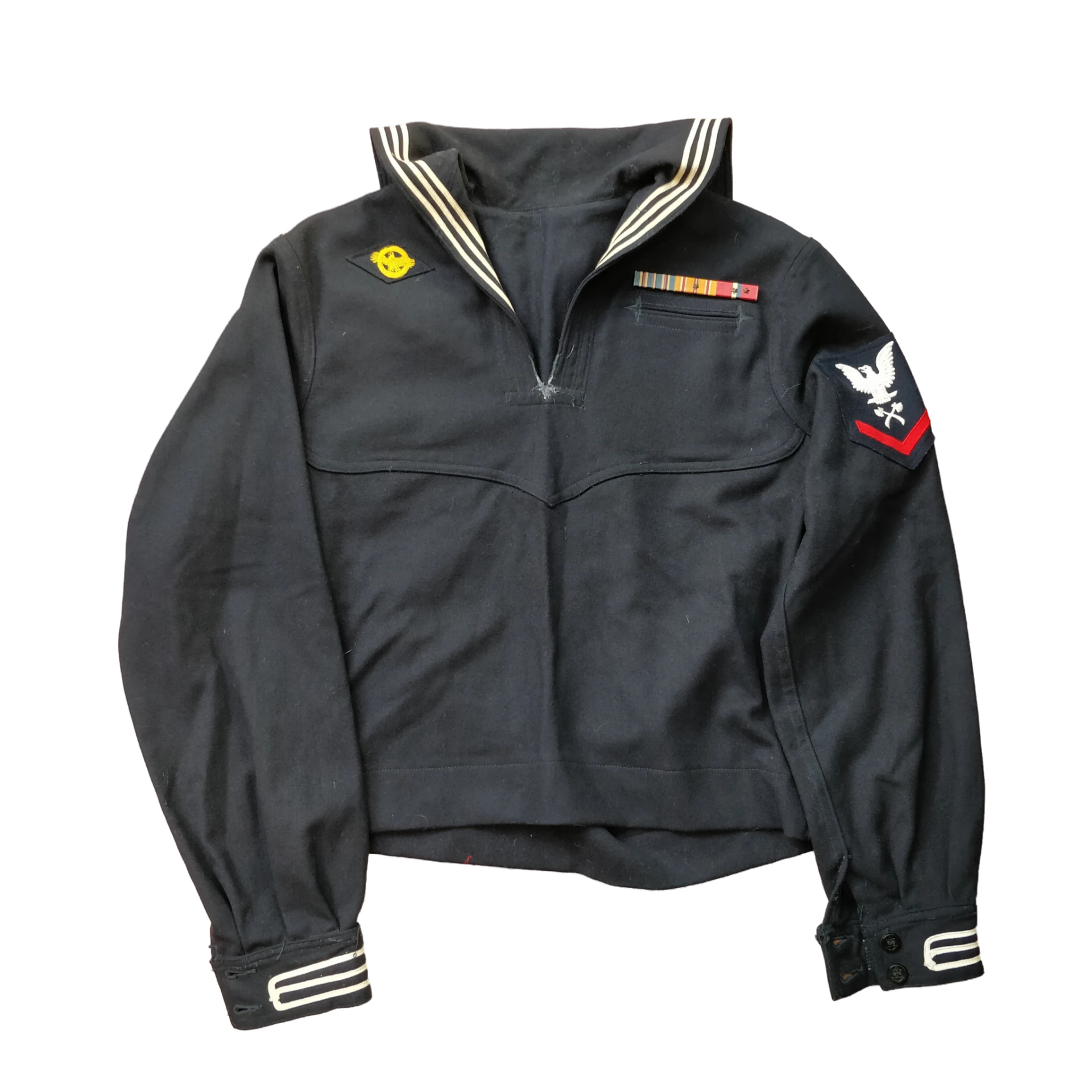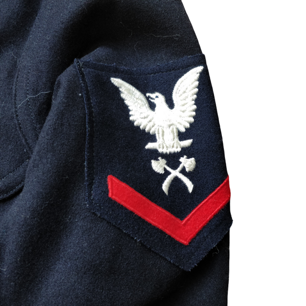 The jacket is still in good condition. There is still a label showing the maker and the jacket is even registered in name! A nice addition to your American Navy collection! The jacket features a ruptured duck and a carpenter's mate rank insignia. There is also a ribbon bar with the American Campaign Medal, the Pacific Campaign Medal with a campaign star, and the Philippine Campaign Medal with two campaign stars.