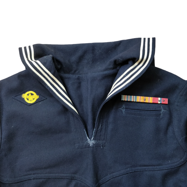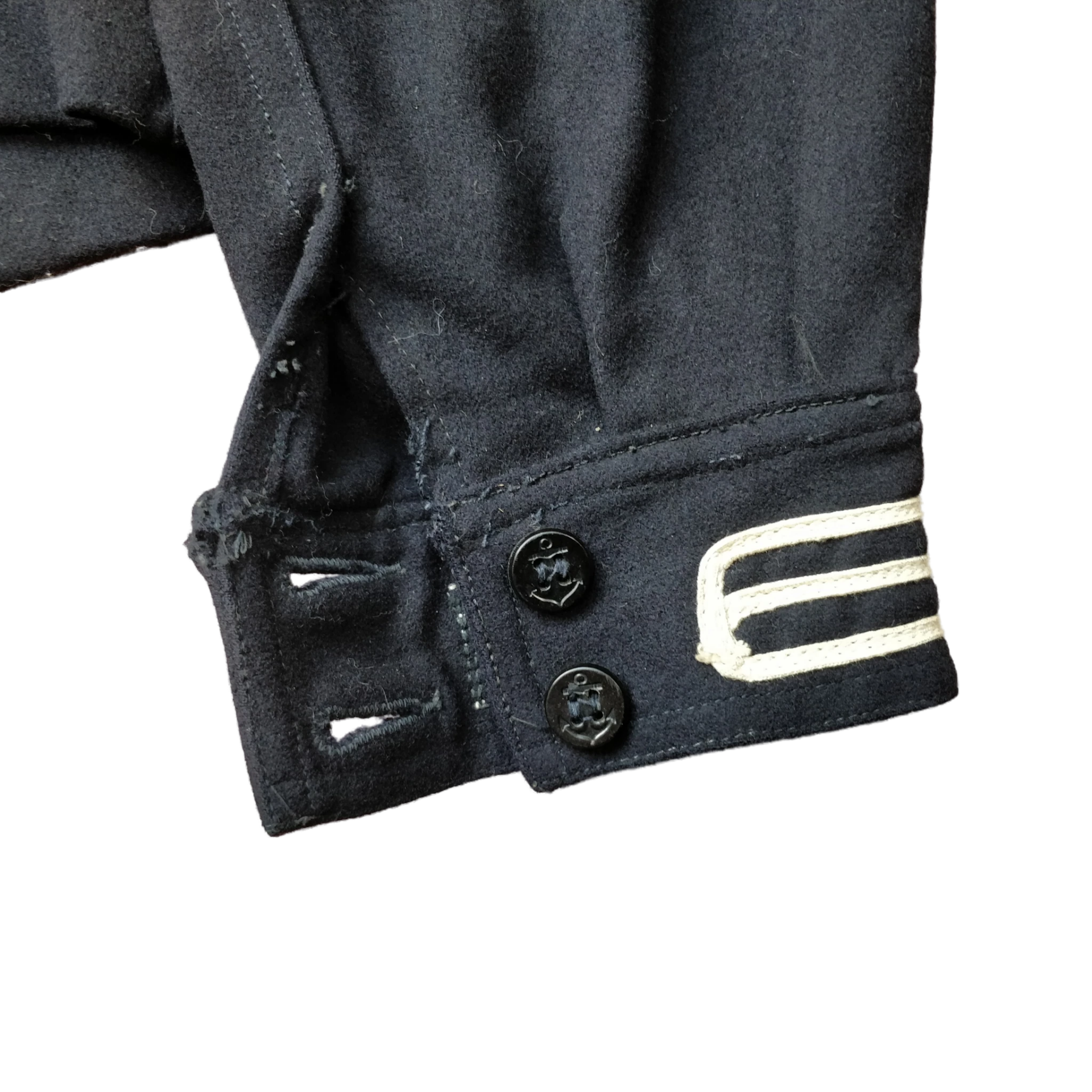 Het jasje is nog in nette conditie. Er is nog een label te zien met maker en de jas is zelfs nog op naam! Een mooie toevoeging voor je Amerikaanse Navy collectie! Op de jas zitten een ruptured duck en carpenters mate rang insigne. Ook zit er nog een ribbon bar op de jas met American Campaign medal, Pacific campaign medal met campaign star en Phillipine Campaign medal met twee campaign stars.