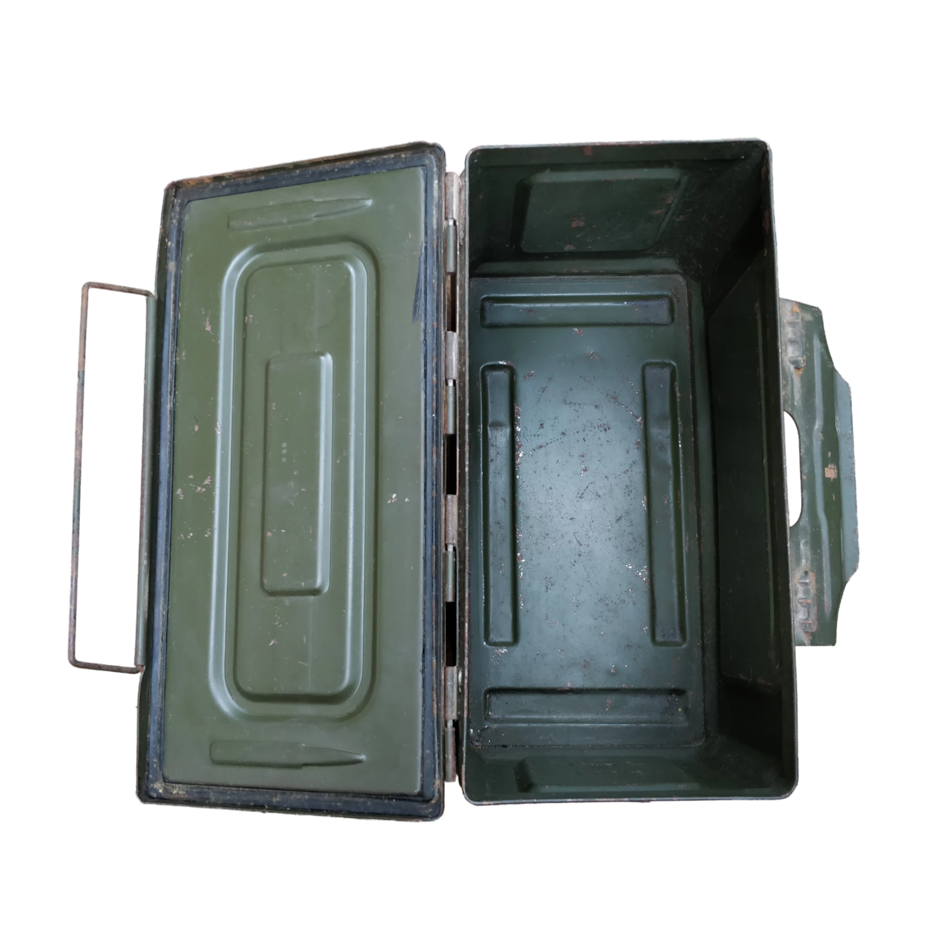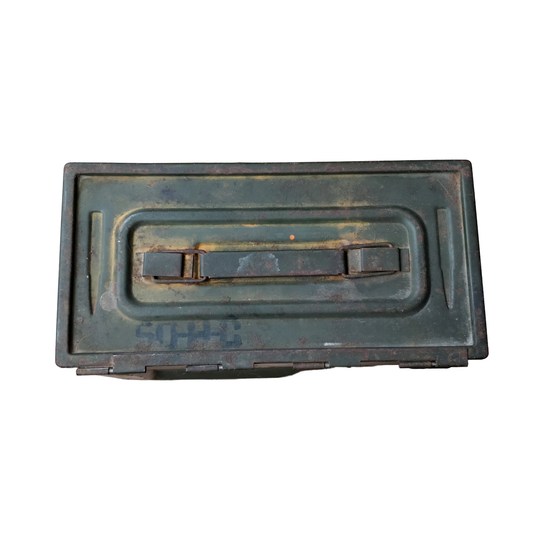 De kist heeft wat gebruikssporen en roestplekjes maar is over het algemeen nog in nette conditie. De kist sluit wat stroef en heeft nog mooi de geschilderde letters aan de zijkant staan. Een mooi item voor een Amerikaanse display!