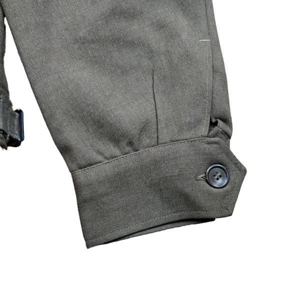 The set is still in reasonably good condition and consists of a jacket and trousers. The jacket has armored collar discs and an armored command patch on the shoulder. It also has a meritorious patch and sergeant rank stripes. A Fort Knox label was still in one of the pockets.