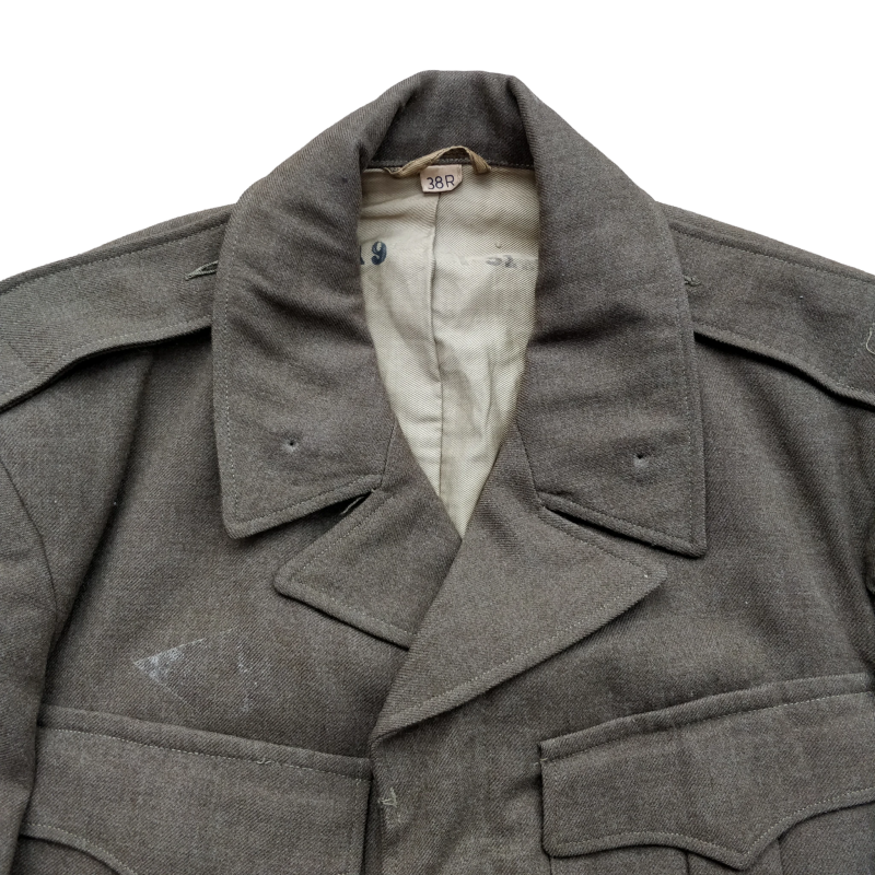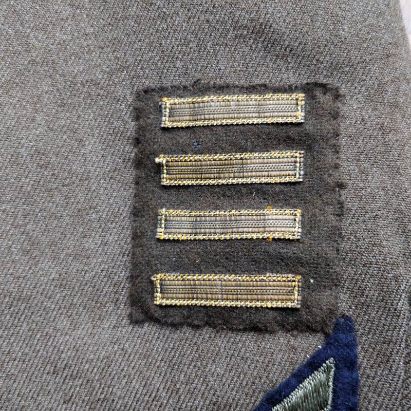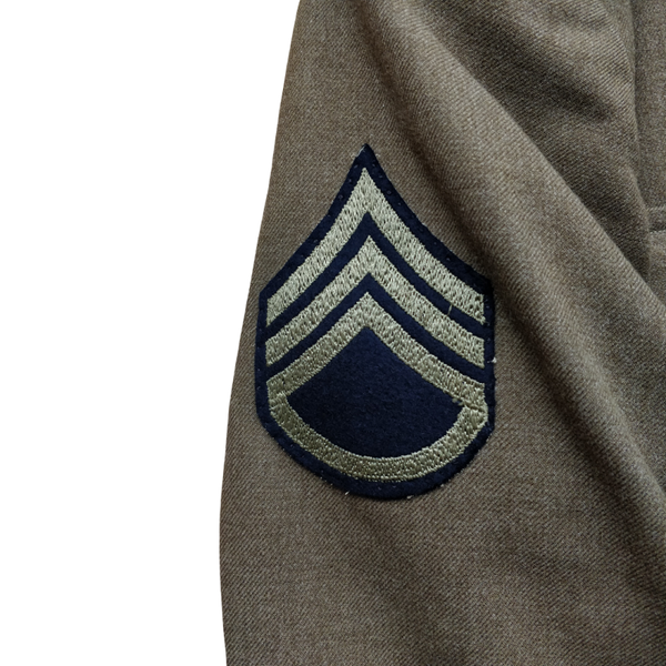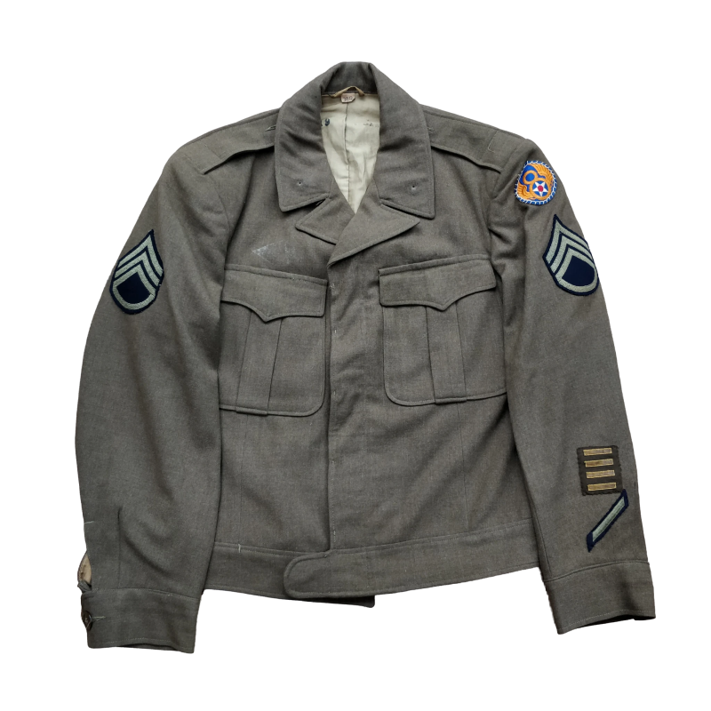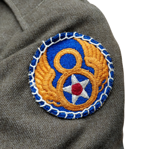 The Ike Jacket is still in very good condition, except for a few minor spots. It belonged to a soldier in the U.S. Air Force. It comes with an 8th Air Force patch, service stripe, and British-made overseas bullion bars! It also has staff sergeant rank stripes and a laundry code in the collar. The label inside the jacket is still legible; it's a size 38R. A beautiful piece for the American collector!