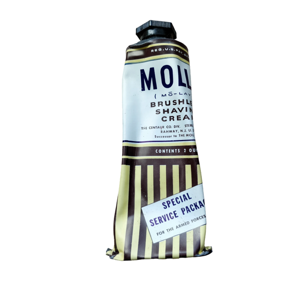 De scheerschuim is nog zo goed als vol! Deze scheerschuim werd uitgereikt aan Amerikaanse soldaten tijdens de Tweede Wereldoorlog zodat zij zich ook in het veld konden scheren. Op het doosje zit een kleine beschadiging maar verder is de set nog in nette staat. Een leuk persoonlijk item van de Amerikaanse soldaat!