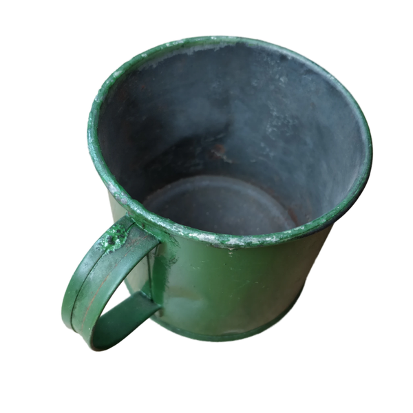 De cup is in nette staat, maar heeft een deukje. Deze cups zijn gemaakt van Amerikaanse Rantsoenblikjes. Een interessant en uniek stuk die de schaarste in oorlogstijd laat zien!
