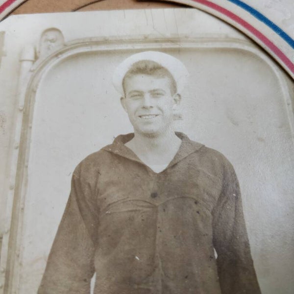 De foto is helaas erg beschadigd/gescheurd. Op de voorzijde staat nog een naam en op de achterkant van de foto staat ook nog tekst.