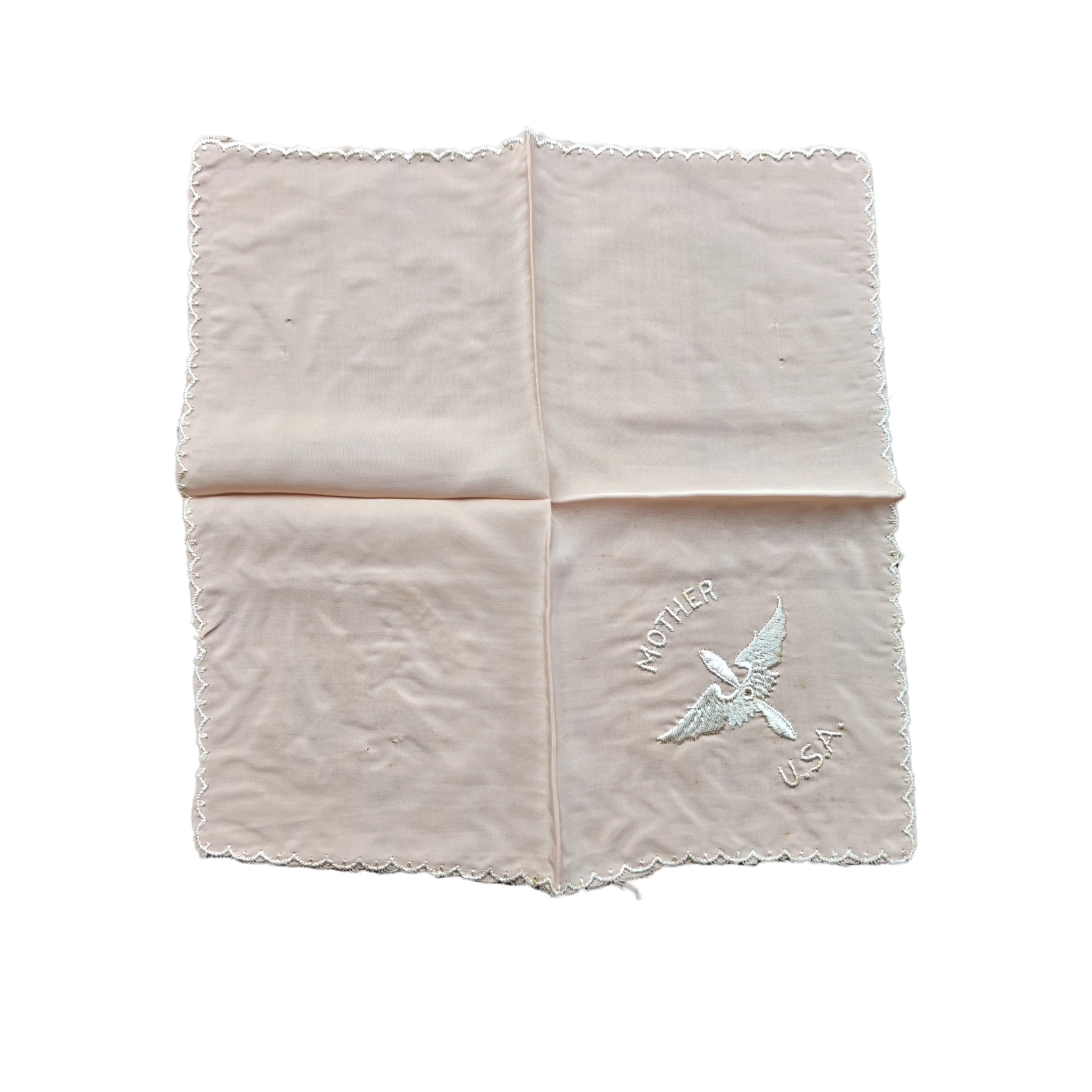 De zakdoek is nog in nette staat. Deze zakdoekjes werden gebruikt door vrouwen, moeders of andere familieleden van Amerikanen die in het leger dienden. Een mooi item voor display!
