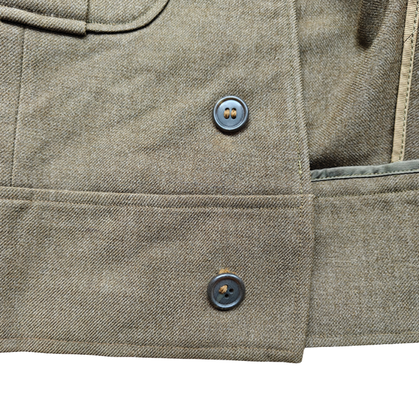 De jas is vernaaid vanuit een class A jacket (tailored) en hierbij is de voorzijde veranderd met knopen en een gesp. Daardoor uniek!