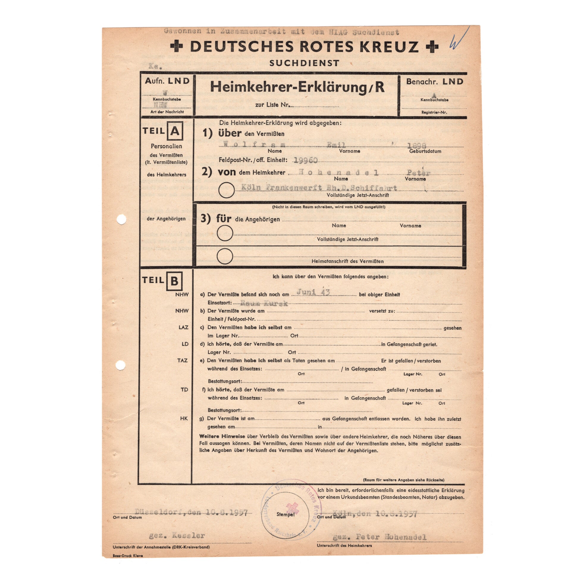 Dit document is van na de Tweede Wereldoorlog. Het is een opsporingsopdracht voor een Duitse soldaat die in de oorlogsjaren vermist is geraakt. Erg interessant voor de onderzoeker of de DRK verzamelaar!