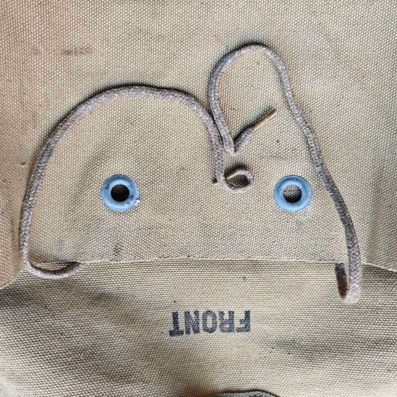 The vest is in reasonably neat condition. It shows some signs of use, such as a broken strap and a small tear in one of the pockets. Otherwise, the color is still very neat, the cords are present, and the stamps are clearly legible.